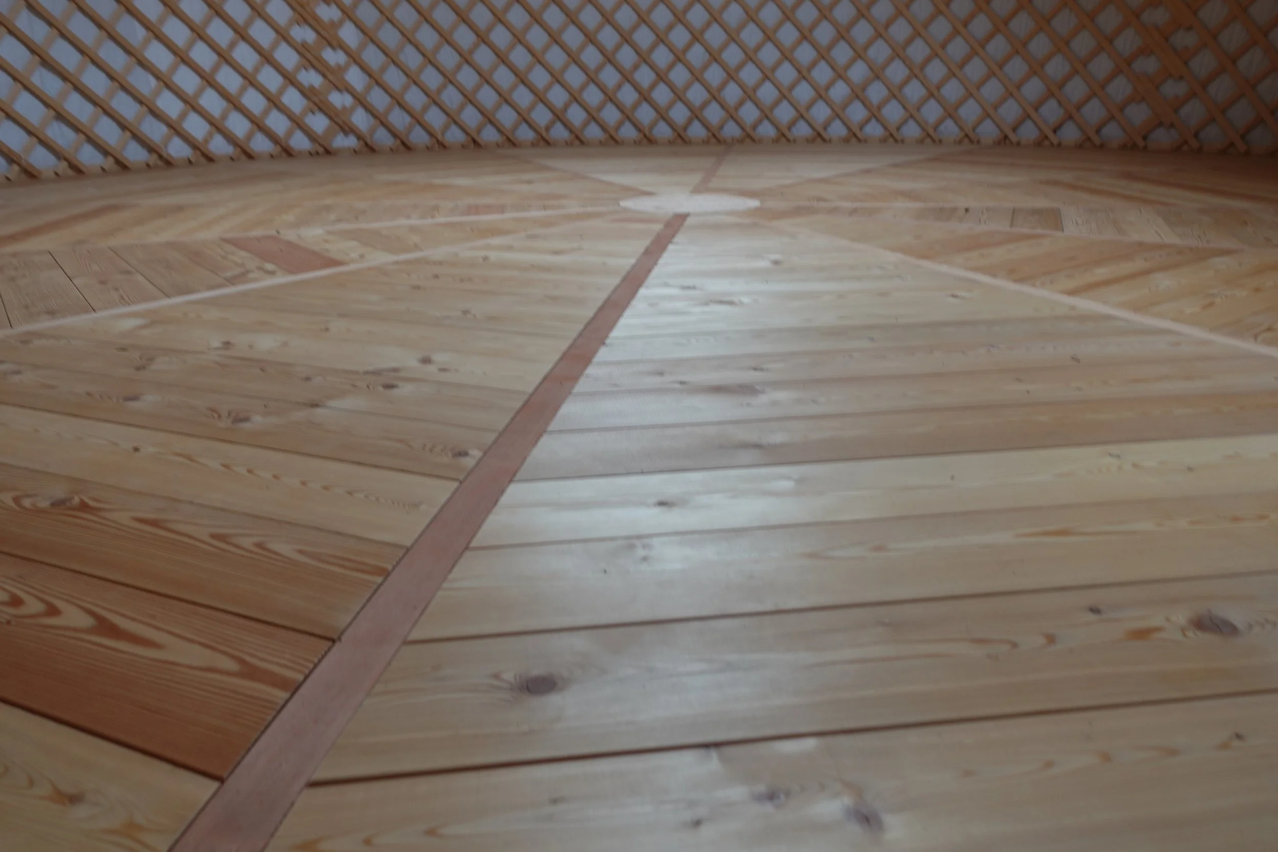Der kunstvoll gefertigte Boden aus heimischen Lärchenbrettern ist nicht nur sehr schön, sondern er fühlt sich besonders barfuß außergewöhnlich angenehm an. Nicht nur deswegen darf die Jurte nie mit Schuhen betreten werden.